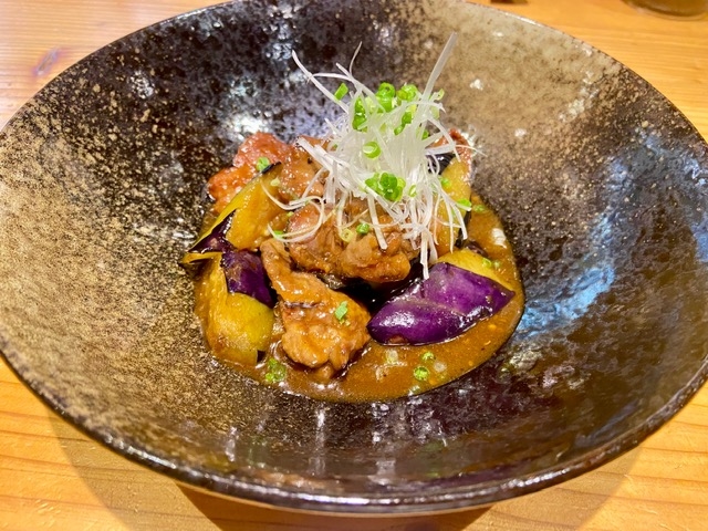 やわらかい県産の鶏白レバーをソテーし、旬のナスを揚げ