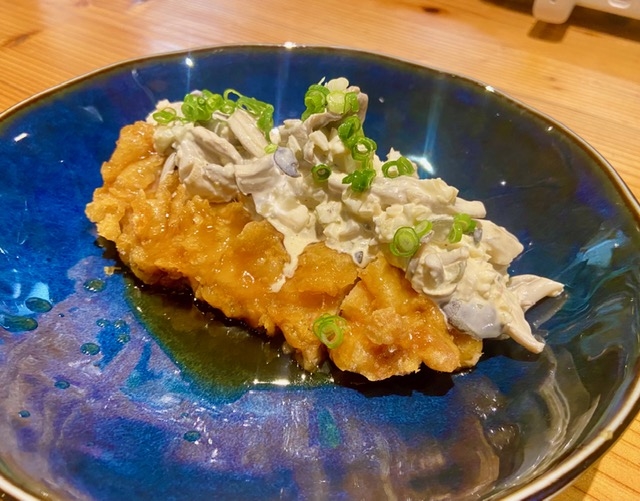 衣で揚げた鶏肉に甘酢を合わせチキン南蛮にし、旬のキノコを入れたタルタルソースをのせました。