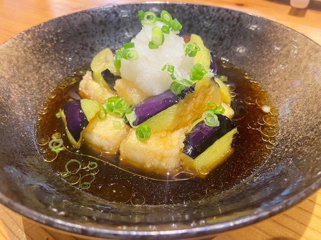 旬のナスと絹ごし豆腐を揚げ、大根おろしをのせ、みぞれ仕立ての揚げ出しにしました。