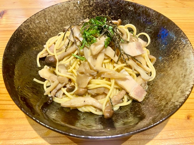 自家製のスーチカーと旬のキノコであっさり味の和風パスタにしました。