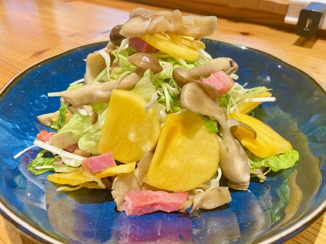 旬の柿とマリネにしたマイタケ、シメジなどのキノコを合わせサラダにしました。