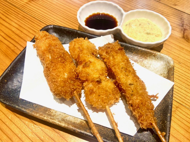 鶏モモ、むきエビ、豚バラをパン粉で揚げ串揚げにしました。